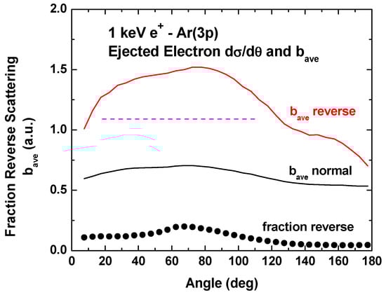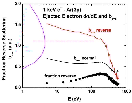 Regarding post-collision kinematics, Figure 5 demonstrated that “reverse” scattering can be quite important on the fully differential level for ionization of argon by fast positrons. In Figure 6 and Figure 7, the relative importance is shown at the single-differential level. As a function of ejected electron energy, Figure 6 shows that the importance of “reverse” scattering increases from approximately 10% to roughly 1/3 around 200 eV, after which it systematically decreases. Included in the figure are average impact parameters, bave, for both “normal” and “reverse” scattering. For ejected electron energies less than a couple hundred eV, bave for “normal” scattering is roughly constant and significantly smaller than the centroid (magenta dashed line) of the 3p radial distribution (magenta curve on left vertical axis). For higher energy ejected electrons, bave systematically decreased. “Reverse” scattering is seen to occur for collisions outside the 3p radial centroid for ejected energies less than a couple of hundred eV, after which the collisions occur at smaller and smaller impact parameters. Note that the increase in the relative importance of “reverse” scattering is proportional to the decrease in the impact parameter for this process, and that the decrease at higher energies begins when the impact parameters for both “normal” and “reverse” scattering begin their decrease.