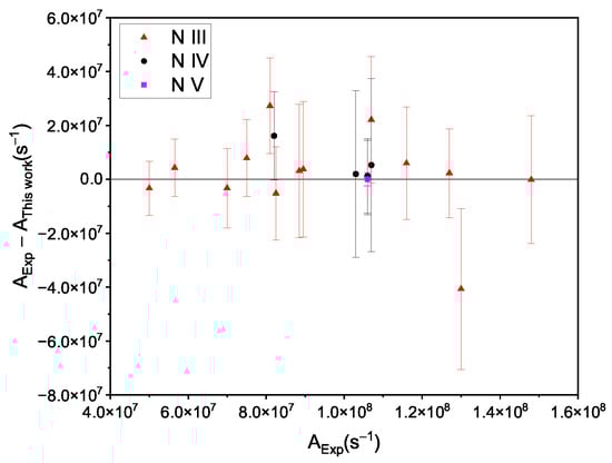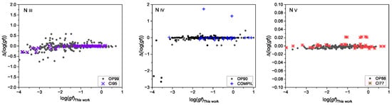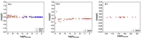 The values obtained in the present work were also compared with the results from MCHF-BP [,] and configuration interaction (CI) calculations [], as shown in Figure 2. The analysis reveals a strong agreement between the values computed in this work and those from other sources, particularly for transitions with values exceeding −4. Specifically, when comparing the present results with the CI calculations by Correge and Hibbert [] for N iii, all available transitions agree within 16%, with 47 out of 51 common transitions demonstrating relative differences of less than 5%. Additionally, when the present MCDHF/RCI results are compared with the MCHF-BP calculations [,], the proportions of transitions with relative differences below 5% are 89.3%, 98.5%, and 100% for N iii – v, respectively.