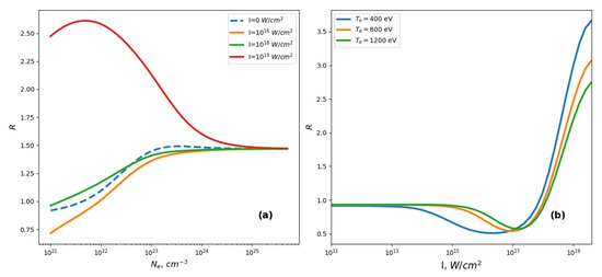 Examples of calculations are shown in Figure 1 for the photon energy = 1200 eV, which is sufficient for the ionization of states 2l12l2 and the excited states of Ar XVIII, although it is lower than the ionization potential of the ground state 1s. Figure 1a demonstrates that photoionization at low density leads to an increase in the R-value, as also follows from Equation (2). For example, at W/cm2 and an electron density of 1021 cm−3, the calculated value is , which is consistent with the value of aα (See Equation (3)). Note, a slight discrepancy between analytical and numerical calculations is possible and related to the disruption of some conditions supposed for Equation (3) or error bars of data used for the radiative–collisional codes. As the density increases, the collisional processes between 2l12l2 states become important and it leads to an LTE equilibrium within the configuration. In Figure 1b, condition (5) is satisfied at W/cm2, which corresponds to the beginning of the change in the intensity ratio.