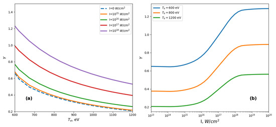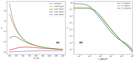 Equation (5) also applies to the ratio of satellite lines to Lyα in the case that the photopumping energy is sufficient for the ionization of excited states. The results for the photon energy = 1200 eV are shown in Figure 3. The transition 2p2 1D2–1s2p 1P1 was chosen as the most intense, but the functional dependence of all satellites 2l12l2 or their sum remains the same. For the case of = 1200 eV in Figure 3b, condition (5) is satisfied at W/cm2 when the ratio Y is changed. By increasing the external pump intensity, the ratio Y shifts to higher values, while the functional form of temperature dependence remains the same, which is confirmed by Figure 3a.
