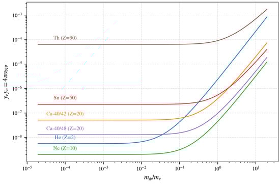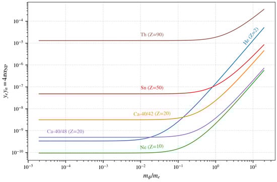 In the mass range considered in this work, the finite nuclear size (FNS) effects are strongly suppressed, and therefore, neglected in Equation (5). The heaviest bosons included in our analysis correspond to interaction ranges that are several times larger than a typical nuclear radius. As a result, the boson-mediated interaction effectively probes the nucleus as if it were point-like. This makes the nuclear size effects insignificant for the entire parameter space explored in this study.