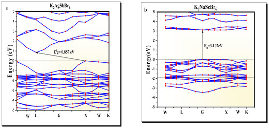 Band structure of (a) K2AgSbBr6 and (b) K2NaScBr6 double perovskites.