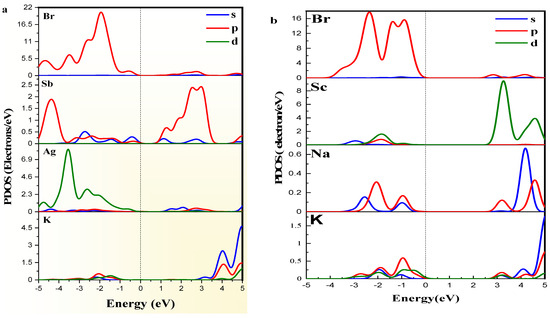 PDOS of (a) K2AgSbBr6 and (b) K2NaScBr6 double perovskites.