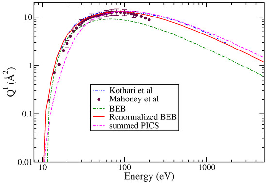Here, , and . represents the scaling factor. This model is now termed as the modified BEB model (mBEB). can be obtained as a ratio of experimental BR (PICS/TICS) and [14]. The overall uncertainty in computed PICS is due to the basic nature and limitations of the BEB model as highlighted above. It must be kept in mind that while the TICS are measured fairly accurately from experimental set ups, the PICS have shown greater uncertainty, varying between 20–25%.