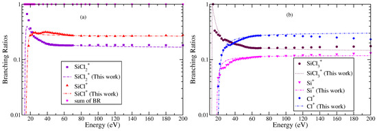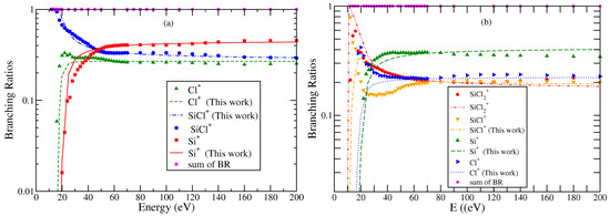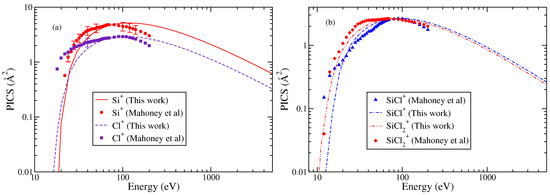 Since the BEB results were lower than the experimental results, these were therefore normalized to match the experimental data at peak value. This practice was followed in the past [26,27] to obtain best results from the modified BEB model. The PICS were then obtained for singly ionized cations like , SiCl+, Si+, and Cl+ using Equation (2). The results shown in Figure 3a,b were obtained using the AE for the various ions, which ranged between 10.3 and 12.5 eV for and SiCl+, and were 18 eV for Cl+ and 20 eV for Si+ [23].