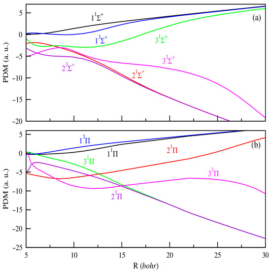 PDMs for the 1,3Σ+ (panel (a)) and 1,3Π, (panel (b)) electronic states of MgRb+.