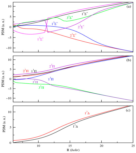 PDMs for the 1,3Σ+(panel (a)), 1,3Π, (panel (b)) and 1,3∆ (panel (c)) electronic states of SrRb+.