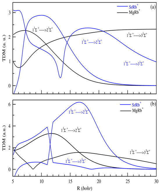 TDMs from 11Σ+ to (i + 1)1Σ+ (panel (a)) and 13Σ+ to (i+1)3Σ+ (panel (b)) electronic states of MgRb+ and SrRb+ (i = 1, 2).
