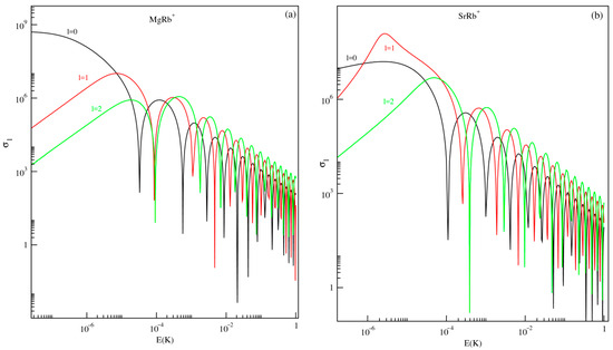 Partial wave scattering cross section as a function of collision energy E (in Kelvin) for the MgRb+ (panel (a)) and SrRb+(panel (b)) molecular ions in the first excited state 21Σ+.