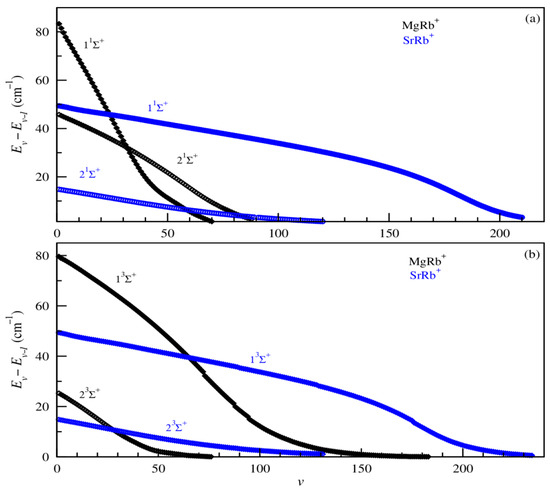 In addition, the prediction of the formation of cold molecular systems also requires the knowledge of the vibrational lifetimes as well as absorption and emission spectra. In current experiments with cold ion–atom systems, vibrational lifetimes provide valuable insights into the formation mechanisms and spectroscopic behavior of molecular ions. In this part of the paper, we represent in Figure 7 the vibrational level spacing between the adjacent vibrational states (Ev–E(v−1)) of the ground and bound excited electronic states 1,3Σ+ of the investigated MgRb+ and SrRb+ molecular ions, while radiative transition probabilities (Einstein coefficients) and the lifetimes for all vibrational levels of both ground 11Σ+ and first excited states 21Σ+ are illustrated in Figure 8, panels (a), (b), and (c), respectively.