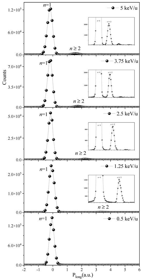 The longitudinal recoil ion momentum distributions are shown in Figure 3 and the relative cross sections are listed in Table 1. The absolute scale of momentum was calibrated using the well-defined single electron capture process in He+–He collisions [21]. Different peaks correspond to different final capture states (where n represents the principal quantum number of the captured electron), with the recoil ions being in the ground state. Within the measured energy range, the experimental results indicate that the process of single electron capture into the ground state (n = 1) of the projectile is dominant, which is consistent with the consideration of “resonant electron capture” [30]. This is a common feature of symmetric ion–atom charge transfer processes, as the ground state transfer in He+–He collisions is a resonant charge transfer process with a binding energy difference of 0 before and after the reaction. With the increase of projectile energy, in addition to the dominant reaction channel, contributions from excited state transfer (i.e., target electrons captured into states with n ≥ 2) can be identified, and the relative contribution of this process increases with increasing energy.