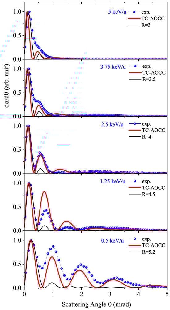 In Figure 4, we also present the angular-differential cross sections calculated by the TC-AOCC method and compare them with the experimental measurement data at the same collision energy. Within the energy range of this study, both the experimental results and the TC-AOCC theoretical results exhibit rich irregular oscillatory structures within the selected angular range. Specifically, for the collision energy E = 0.5 keV/u, the TC-AOCC results agree well with the experimental data when the scattering angle is less than 1.5 mrad; for E = 1.25 keV/u, 2.5 keV/u, 3.75 keV/u, and 5 keV/u, the TC-AOCC results show good agreement with the experimental data for scattering angles of less than 1 mrad. For larger scattering angles, the TC-AOCC results underestimate the cross sections.