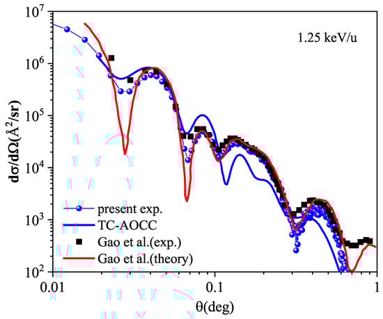 Figure 5 shows the calculated differential cross sections for He+–He collisions at an energy of 1.25 keV/u, as well as the experimental and theoretical results of Gao et al. [34]. For easier comparison with the experimental data of Gao et al., we adjusted the second maximum of our own experimental data to correspond to the position of the second maximum reported in the study by Gao et al. At this collision energy, our experimental results, along with the experimental and theoretical results of Gao et al., all exhibit rich irregular oscillatory structures within the selected angular range. Among them, the structure of our experimental results at the minima is clearer, which indicates that the resolution of this experiment (approximately 0.01° [37]) is higher than that of Gao et al.’s experiment. It can be seen from the figure that our experimental and theoretical results are in good agreement with those of Gao et al. over the entire studied angular range. For this energy point, when the scattering angle θ < 1 deg, the TC-AOCC calculation results are in fairly good agreement with the experimental data and also quite well predict the positions of the cross-section maxima and minima. For larger scattering angles, the TC-AOCC results underestimate the cross section, while the calculations by Gao et al. continue to agree well with the experimental data [23].