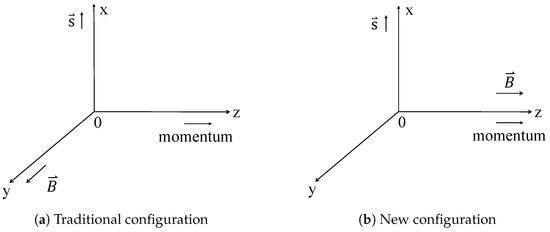 Larmor time is defined for a spinning particle in a magnetic field. Specifically, when a particle traverses a constant magnetic field, its spin rotates around the field direction, a phenomenon known as Larmor precession. The tunneling time is defined as the ratio of the accumulated precession angle in the barrier region to the particle’s angular velocity. Two configurations are commonly used: 1. the traditional configuration with a magnetic field perpendicular to the motion direction [22]; and 2. the configuration in [15], where is parallel/antiparallel to the transmitted/reflected particle’s momentum. As shown in Figure 1, both configurations feature initial spin orientations perpendicular to the magnetic field. To avoid notational conflicts, these will be referred to as the “Baz–Rybachenko–Büttiker (B) [12,14,22]” and “Xiao–Zheng–Liu (X) [15]” configurations.