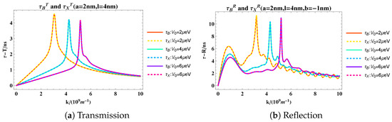Starting from Equation (2), similar to the solution to the tunneling problem of a one-dimensional square barrier [25], we can establish the continuity equations and then solve for the specific forms of the transmission () and reflection () amplitudes using the transfer matrix method [26]. The subscripts 1 and 2 in the transmission and reflection amplitudes correspond to the spin-up and spin-down states, respectively. The terms , , , , , and are wave number-dependent amplitudes.