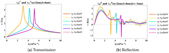 The forms in the definitions of various functions adopt similar definitions as those in Ref. [16]. Figure 3 shows the variation of Larmor time with wave number for the trapezoidal barrier. Different barrier heights are selected for comparison. Under the selected barrier parameters, it can be observed that the transmission Larmor time exhibits almost no oscillation, while the reflection Larmor time oscillates. Both show an overall trend of increasing first and then decreasing with the wave number. Furthermore, as the height of the barrier increases, the wave number corresponding to the peak tunneling time also increases. In addition, the results shown by the solid and dashed lines in the figure are consistent, indicating that the Larmor times for the two configurations we discussed are almost indistinguishable for the trapezoidal barrier.