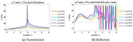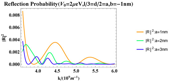 Here, we directly show the results of the variation of Larmor time with wave number for the trapezoidal barrier. We select the same barrier height, keep the proportion of the three parts of the trapezoidal barrier unchanged, and change the overall barrier width for comparison. Figure 5 shows that as the overall width of the barrier increases, the wave number corresponding to the peak of the transmission Larmor time only changes by a little, while the peak intensity increases with the increase in the barrier width. The oscillation of the reflection Larmor time is more pronounced. As the wave number increases, there are a series of “sharp jumps” (discontinuities) in the reflection Larmor time. These “sharp jumps” arise from the flaws in the definition of Larmor time itself. The wave numbers at which these jumps occur coincide with those for local minima of reflection probability in narrow intervals. The reflection probability versus wave number is shown in Figure 6. To demonstrate the precise correspondence between the jumps and the reflection probability, we take the case of a = 1 nm as an example and create Table 1 for further illustration. The results in Table 1 show that the wave numbers corresponding to the minimum values found in the reflection probability indeed coincide with those at the jump positions within the given precision. We argue that at these wave numbers, the reflection probability is nearly 0, and the ratio () changes significantly around 1, which leads to the occurrence of jumps in the reflection Larmor time.