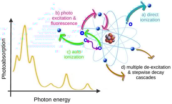Photoabsorption generally comprises all (quantum) processes of matter that annihilate radiation from a light source and, subsequently, lead to the emission of light and particles at various energies, including exotic processes, such as photoluminiscence, the scattering of light, or even the creation or annihilation of (electron–positron) pairs. For neutral atoms or multiply charged ions, as well as for moderate photon energies, however, the photoabsorption can be considered synonymous with the sum of direct photoionization and the (resonant) excitation of bound electrons due to their coupling to the radiation field. This is summarized in Figure 1. In this approximation, the photoabsorption cross-section of ions at the initial level i is usually expressed by the incoherent summation of the (non-resonant) partial photoionization cross-sections of bound electrons, as well as the photoexcitation of the ion, with subsequent fluorescence and/or autoionization, as follows: