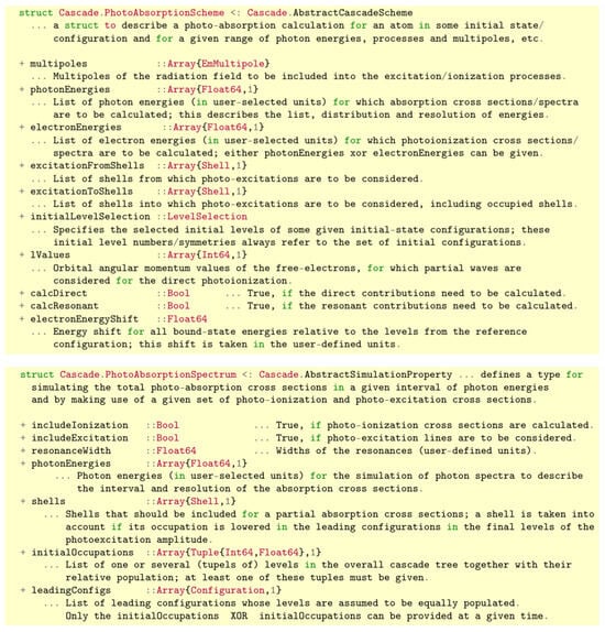 Most central to the computation of photoabsorption cascades and spectra, perhaps, is the type Cascade.PhotoAbsorptionScheme <: Cascade.AbstractCascadeScheme. The definition of this data type is shown in the upper panel of Figure 2 along with all of its subfields that help to specify the physical parameters of the underlying model of photoabsorption. These fields require the user to select and specify the initial level or configuration of the atom or ion, the range of photon energies, the supposed excitation and ionization processes, the multipole components in the expansion of the radiation field as well as several other physical parameters. Here, we shall not discuss these subfields in much detail but simply remind the user that the internal definitions and use of all data types can be accessed at any time from Jac’s documentation [] or by using Julia’s help facilities.