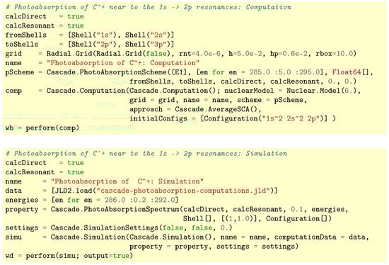 In Jac, we can readily estimate the photoabsorption cross-sections of C+ ions in their 1s22s22p ground configuration by following the script in Figure 3 for performing cascade computations (upper panel) and simulations (lower panel). In these calculations, a Cascade.PhotoAbsorptionScheme has been specified for the three photon energies eV to estimate the direct contribution to the photoaborption cross-section for the excitation (ionization) of an electron from the 1s and 2s shells (fromShells) into either the 2p or 3p shells (toShells) or directly into the continuum. From these shell lists, all possible (five-electron) configurations are then generated automatically, and their mean excitation energy is compared to the incoming photon energies. Within the given interval eV of incoming photon energies, furthermore, the selected photoexcitations are taken into account at their calculated resonance position. In the input of Figure 3, the incorporation of the direct and resonant parts to the total photoabsorption cross-sections is readily determined by the two logical flags calcDirect and calcResonant, respectively. Obviously, only those photoexcitation and ionization data are later available for the simulation of cross-sections, which have been generated (computed) before. This is in contrast to the subsequent simulations, in which parts of the generated data can be still omitted from the simulated spectra by using some proper input script.