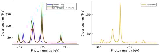 Figure 4 displays the photoabsorption cross-section as function of the incident photon energy in the energy range eV for C+ ions in their initial 1s22s22p ground configuration. The left panel of this figure shows the simulated cross-sections for the two initial 2P1/2/3/2 fine-structure levels as obtained from the present (cascade) computations and simulations. On the right panel, the total photoabsorption cross-section is shown as measured at the PIPE facility in Hamburg []. In these measurements, it was supposed that about 90% of the ions are in the 2s22p 2P ground-term and the remaining 10% are in the 2s2p2 4P metastable term. The simulated photoabsorption cross-section for such an admixture of ground and meta-stable levels is shown as the red curve in the left panel of Figure 4. Overall, a reasonable agreement is found between the measured and simulated spectra despite all the visible differences. The calculated fine structure of the 1s22s22p ground levels appears slightly larger than in the measurements owing to the approximate representation. The single-configuration approach in the underlying cascade computation here limits a more detailed comparison of individual resonances. No further attempts have been undertaken to improve the position and intensities of individual lines. In most photoabsorption spectra and for the excitation and ionization of subvalence electrons, the fine structure can typically be neglected, at least, as long as the level splitting is (much) smaller than the total width of the resonances.