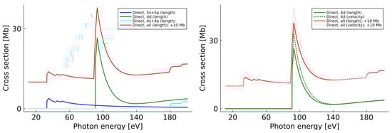 Indeed, our cascade approach to the photoabsorption of atoms and ions enables us to selectively analyze contributions from the photoexcitation and ionization for (i) individual electron shells (fromShells, toShells), (ii) the partial-wave character of the outgoing electrons or (iii) for the superposition of different initial levels. For further details about the corresponding input, we refer the reader to the documentation of Jac and its help facilities. In the figures below, we make use of these (selected) features to distinguish different contributions to the overall photoabsorption, for instance, by displaying shell-resolved cross-sections, in which the occupation of selected shells is lowered by ‘1’ if analyzed with regard to its leading configuration of the initial and final levels. Explicitly, the left panel of Figure 5 compares the partial photoionization cross-section from the 5s + 5p valence electrons (blue line) with those from the 4d (green line) and the 4s + 4p core electrons (cyan line). In the right panel of Figure 5, we compare instead the partial 4d (blue lines) and total photoionization cross-section (red lines) by including the contributions of all shells as obtained in (solid lines) and velocity gauge (dashed lines). Resonant contributions to the photoabsorption are not included in this figure. The restricted wave function expansion in our cascade approach still prevents a closer agreement between the two gauges. Naturally, other classes of inner- and valence-shell excitations could be analyzed in a similar way.