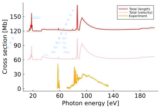 Figure 6 compares the total photoabsorption spectrum of Xe2+ ions in the photon energy region 10–200 eV. The total cross-section from measurements (orange line) are compared with computations in which the direct and resonant contributions were simply added in velocity (pink dashed line; +30 Mb) and length gauge (red solid line; +60 Mb), respectively. For the sake of visibility, the synthesized spectra are each shifted by +30 Mb.