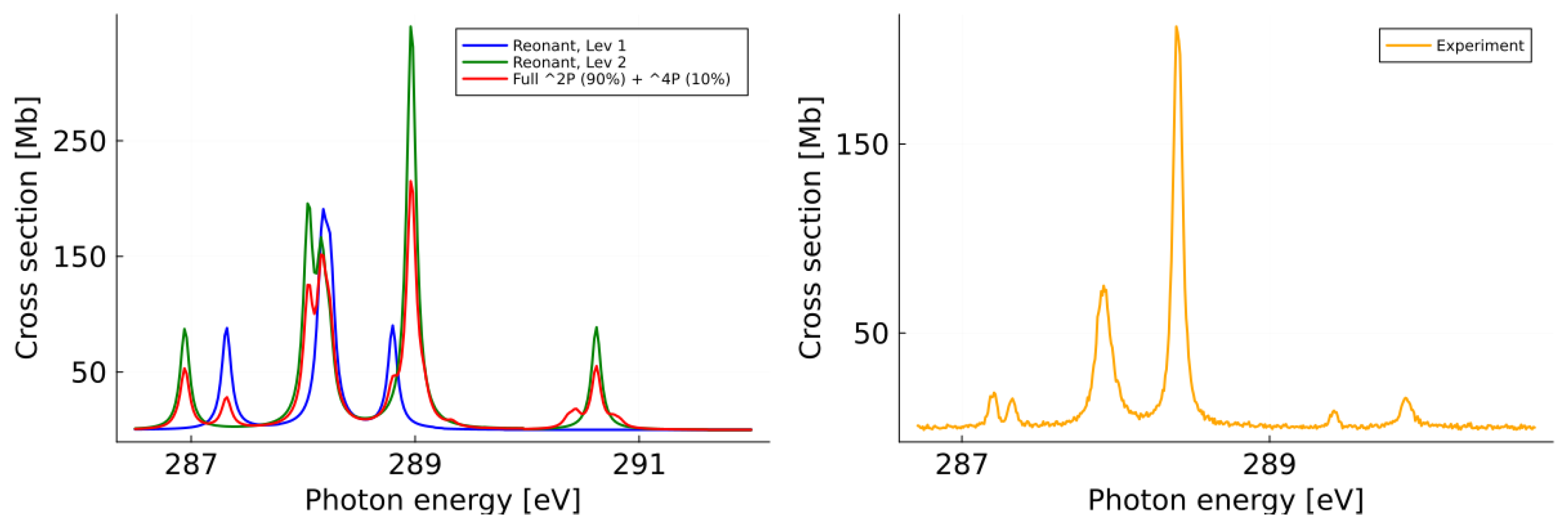 3.1. Photoabsorption of C+ Ions near to Their 1s → 2p Resonances