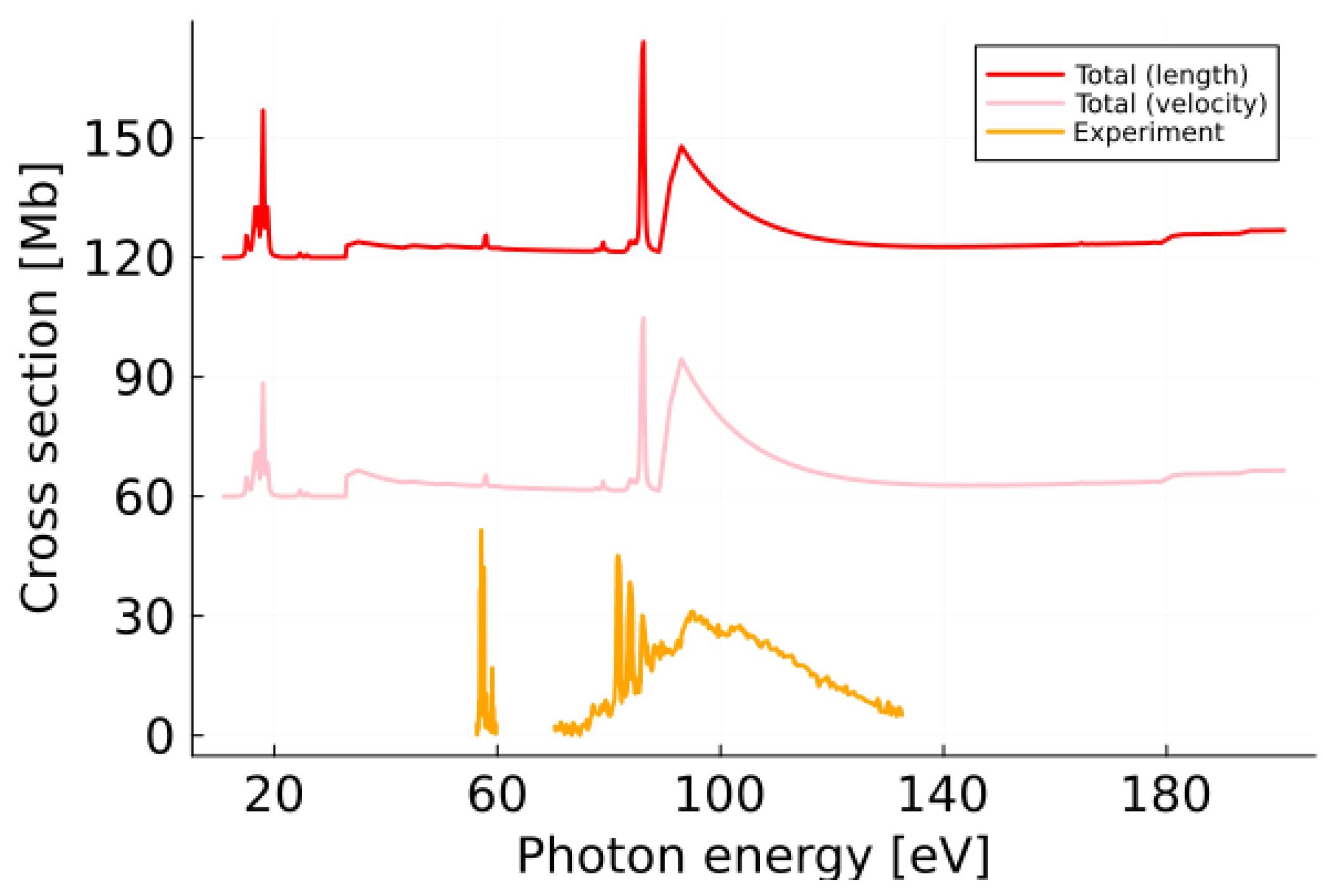 - Tenorio, B.N.C.; Nascimento, M.A.C.; Rocha, A.B. Time-dependent density functional theory description of total photoabsorption cross sections. J. Chem. Phys. 2018, 148, 074104. [Google Scholar] [CrossRef]