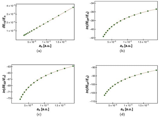 Numerical values for the energy shift induced by a hard-sphere potential of radius are plotted as a function of for a reference hydrogenic state [panel (a)], state [panel (b)], state [panel (c)], and state [panel (d)]. The dots are from the numerical approach outlined in Section 2.2, while the dashed curve represents the analytic result given in Equation (8). Logarithmic scales are chosen for the ordinate axes in panels (b–d). By “a.u.”, we refer to atomic units, i.e., the radius is given in units of .
