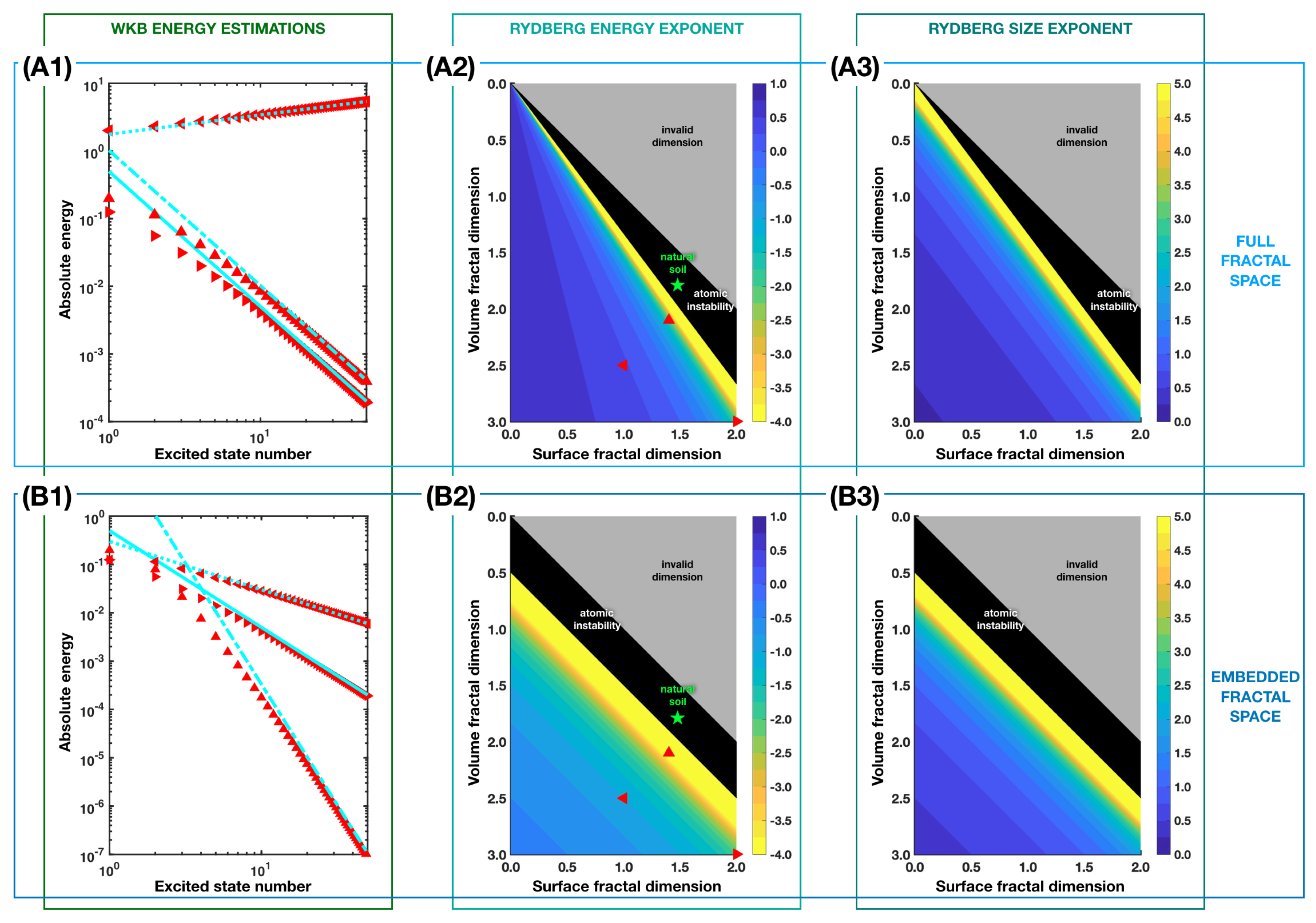 Figure 1. Numerical investigations of atomic properties at different fractalities. The rows in (A) are figures from the full fractal space scenario. (A1) The estimated energy | E ˜ | as a function of excited state number n (from ground-state n = 1 to n = 50 ) in log–log scale, following the solving of Equation (20) numerically. We then compare them with their expected asymptotic behavior, given by Equation (A10). The fractal dimensionalities D v , D s we choose to investigate are 3 , 2 , 2.5 , 1 , and 2.1 , 1.4 ; their numerical values are given by triangle markers pointing right, pointing left, and pointing up, while their theoretical asymptotic behaviors are shown with continuous, dot–dot, and dot–dash lines. (A2) The Rydberg energy exponent and (A3) Rydberg size exponent as a function of fractalities, from Equation (22). The rows in (B) are figures from the embedded fractal space scenario, in which (B1B3) are of similar descriptions with (A1A3).