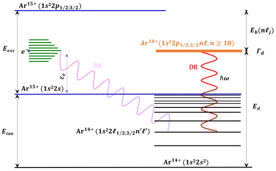 Dielectronic recombination of Li-like argon ions proceeds from the ground state , with a free electron captured into a doubly excited state, . The principal quantum number of the outer electron must satisfy to ensure that the energy of the doubly excited state exceeds the first ionization threshold. The figure is schematic and not to scale.