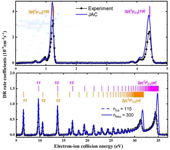 Experimental DR rate coefficients (black filled symbols) for Li-like are presented across the electron–ion collision energy range of 0–37 eV. DR series associated with and core excitations () are observed, with their resonance positions estimated by the Rydberg formula [Equation (10)] and indicated by short colored bars. Theoretical DR rate coefficients from the JAC codes are depicted by the blue solid and dashed lines. These theoretical curves account for recombination into Rydberg states, with principal quantum numbers extending up to —representing the field-ionization-free recombination rate coefficient.