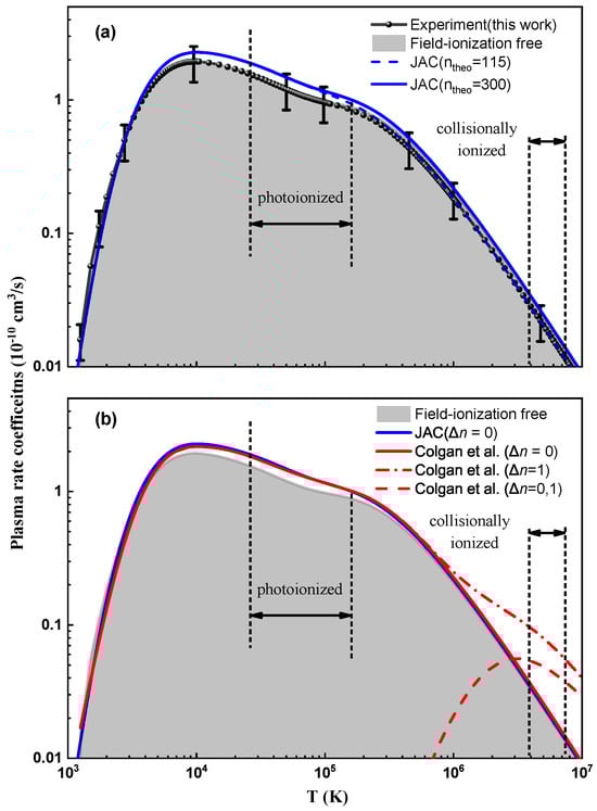 Figure 5a and Figure 5b compare the experimentally derived plasma rate coefficients with the present theoretical results obtained using the JAC code and with previously published theoretical data from the literature, respectively. As shown in Figure 5a, the plasma rate coefficients calculated with JAC are in good agreement with the experimental results within the experimental uncertainties over a wide temperature range, covering both the photoionized plasma regime (– K) and the collisionally ionized plasma regime (– K). Furthermore, the plasma rate coefficients are found to be insensitive to additional contributions from Rydberg states with principal quantum numbers .