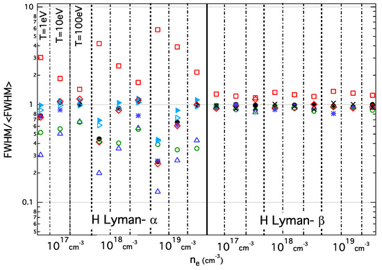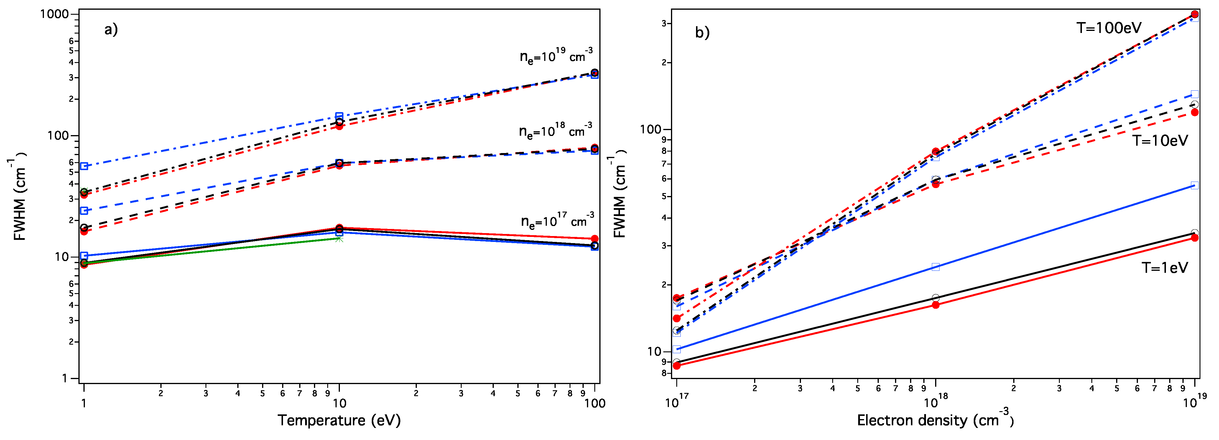 In Figure 2, only results from the numerical simulations are plotted for the sake of clarity. One sees that in the range of 1 to 100 eV, the simulations either predict that the width increases when the plasma temperature increases (for the fixed density cm, they present a temperature dependency as ∼) or predict that the width is mostly insensitive to the temperature’s rise (for the fixed density cm). Concerning the dependence on the plasma density, the width, which is mainly due to the width of the central component for eV, increases as . For eV, the results show a dependence, corresponding to the quasi-static behavior of the lateral components [2]. We mention, however, that the cutoff of the Coulomb interaction at a finite box size may not accurately reproduce an ideal plasma [42].