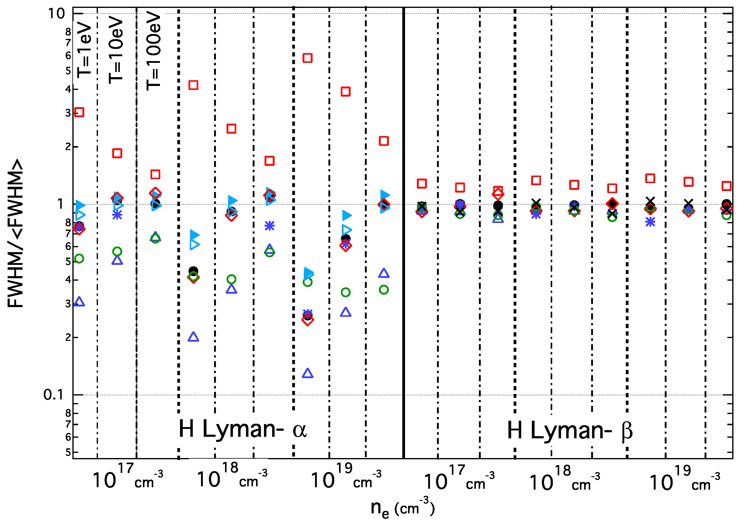The graph is divided in two regions: the left side corresponds to results for the Lyman-α line and the right side to the Lyman-β line. Each region is divided into three sub-regions that correspond to the three densities chosen. Finally, in each sub-region, each set of results corresponds to the temperatures, eV, respectively. For the Lyman-α case, the results present a large dispersion, deviating from the average by more than a factor of five in each direction. In contrast, the scatter for the Lyman-β shows a rather good agreement between the codes. In fact, these two lines present a completely different behavior concerning the ion dynamics effect.