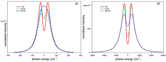 The static profile of the Lyman-β line (as all of the lines) normally shows a dip at the line center. One sees in Figure 4 that, due to the ion dynamics effect, the simulations fill this dip, and the width increases with increasing temperature. This trend is seen for plasma conditions that correspond to typical microfield fluctuation rate values (see Equation (5)) smaller than the splitting of the two Stark components measured in the static case. Here, for cm, the Stark splitting of the static line shape is equal to eV, and the typical fluctuation rate is equal to eV and eV for eV and eV, respectively. For eV, eV, i.e., three-times greater that the Stark splitting in the static case. The two components merge, leading to a line shape that is narrower than the one calculated for eV, as is seen in Figure 4a. Note that for an infinite fluctuation rate, the line shape becomes the Dirac δ-function.