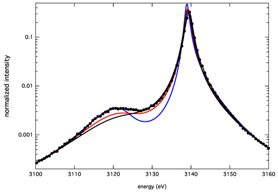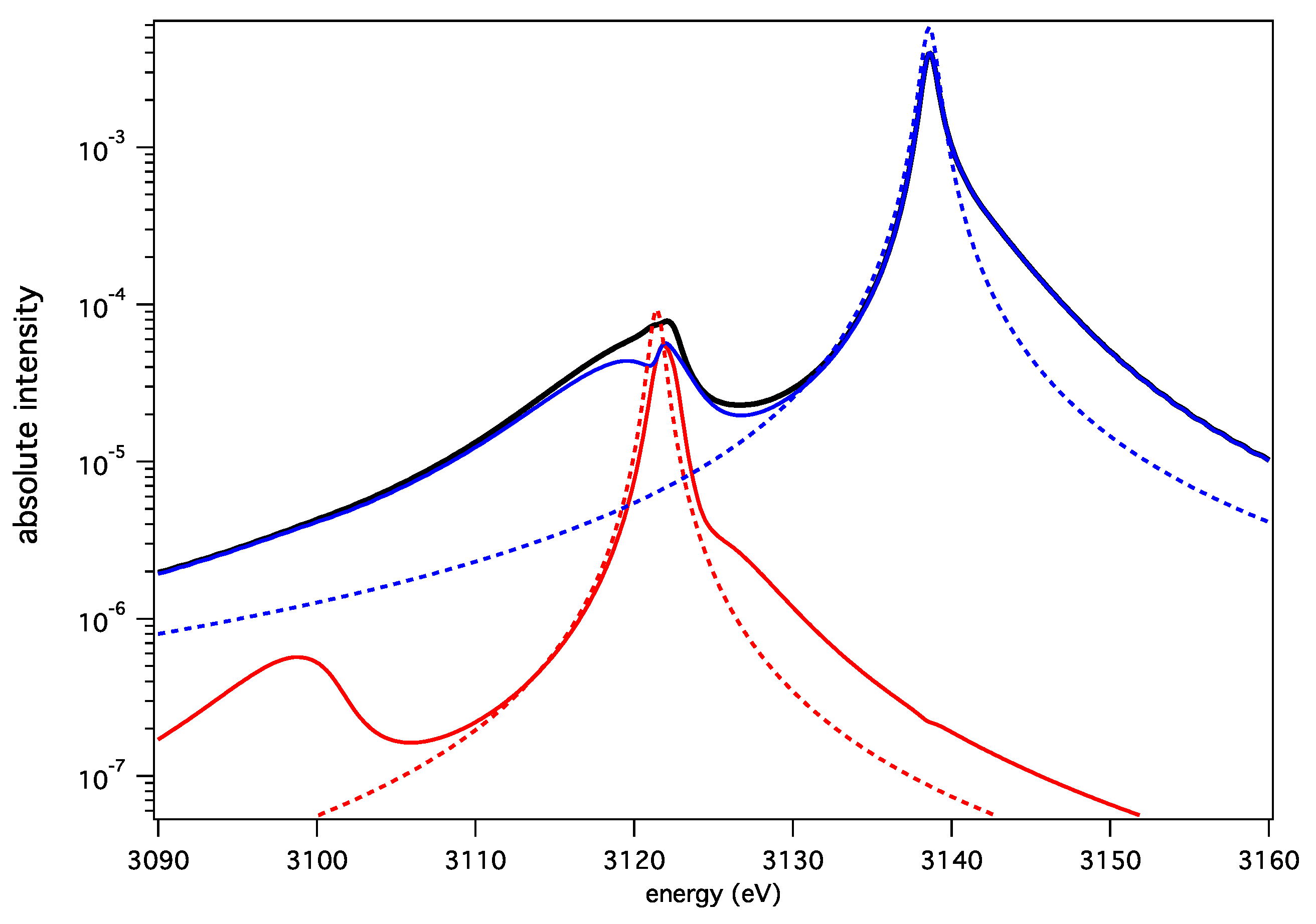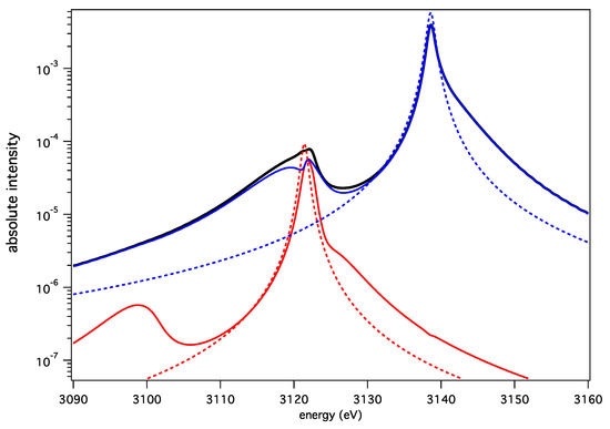 The He-α line calculated within the quasi-static approximation for keV and cm. (Black line) the entire profile; (blue line) resonant line profile; (red line) intercombination line profile. The pure electron-broadened profiles are plotted in dashed lines for each component.