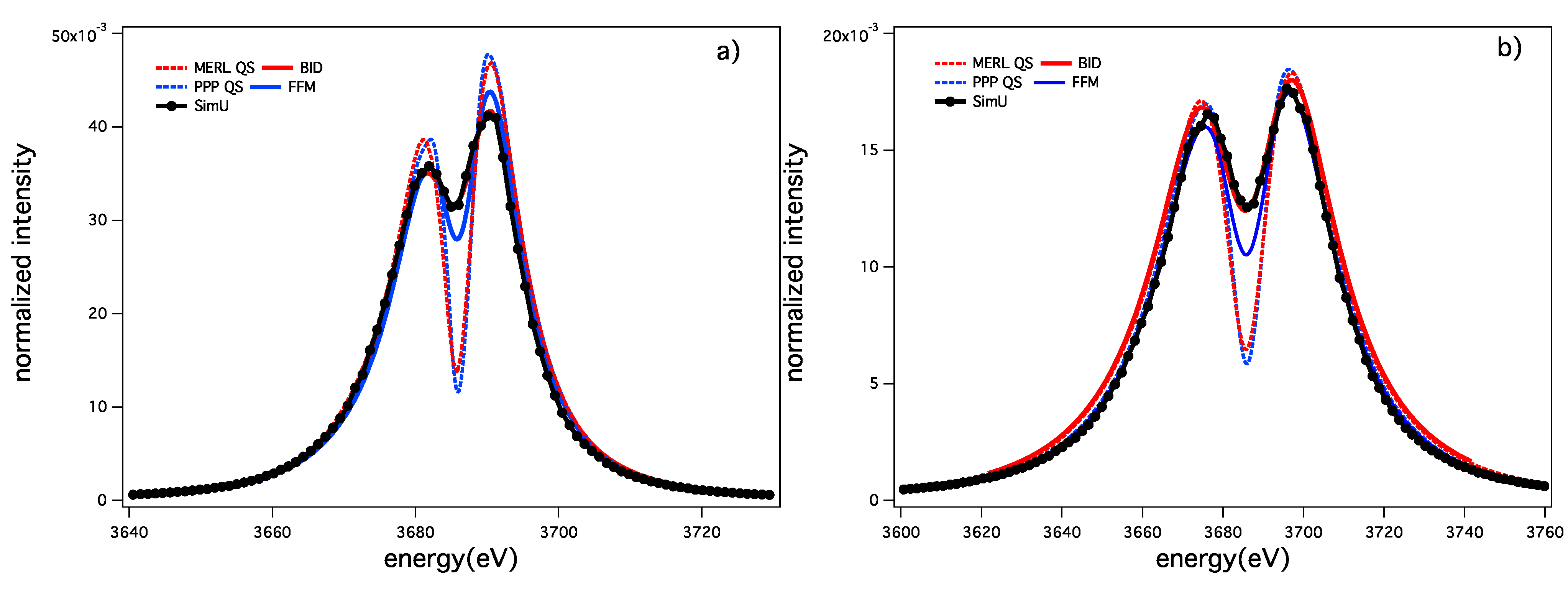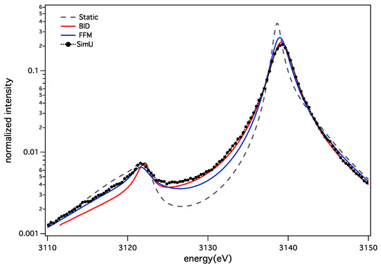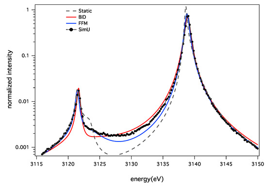 Finally, the He-β line is presented in Figure 11. At the chosen plasma conditions, as the Stark splitting of the He-β quasi-static line shape is greater than the fluctuation rate and the electron width is larger, the ion dynamics effect is less pronounced than on the He-α. Figure 11 shows SimU, BID and FFM in rather good agreement relative to the discrepancies of their quasi-static profiles. The measure of the dynamics-to-static relative depth is defined by: