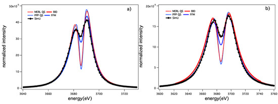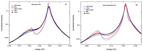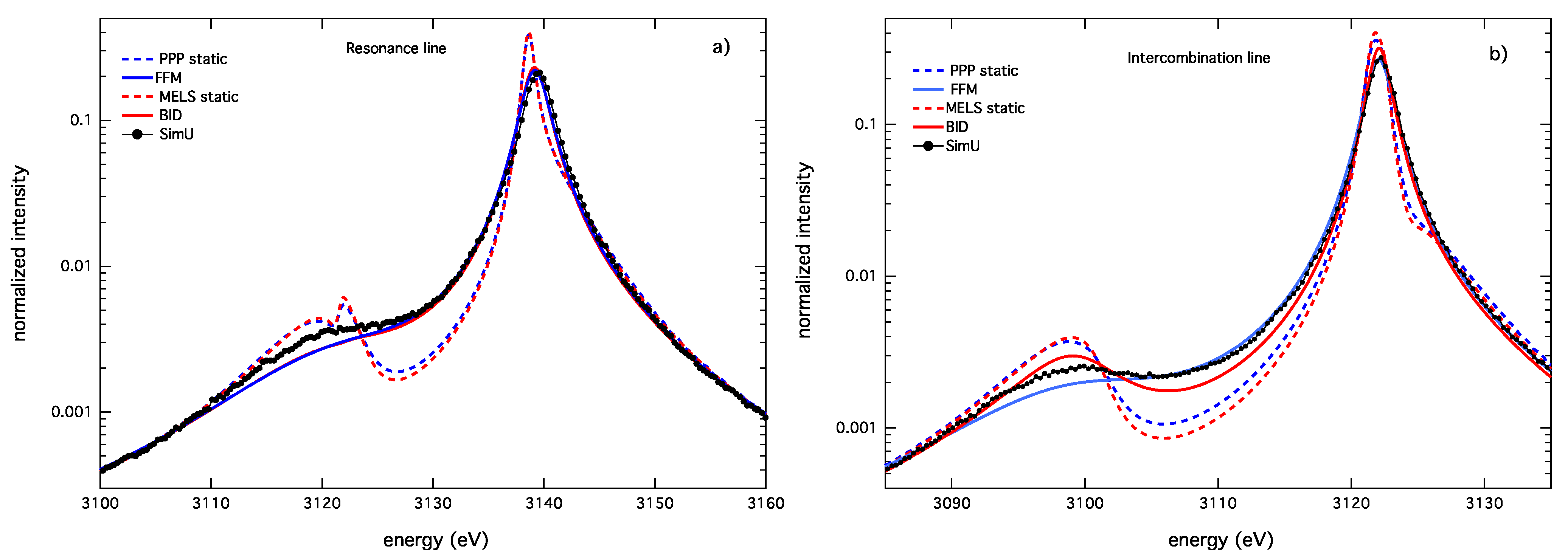 The He-α line for keV and cm: (a) resonance line and (b) intercombination line. Static ions MELS (red dash) and PPP (blue dash); ion dynamics BID (solid red); FFM (solid blue); and SimU (black dot).
