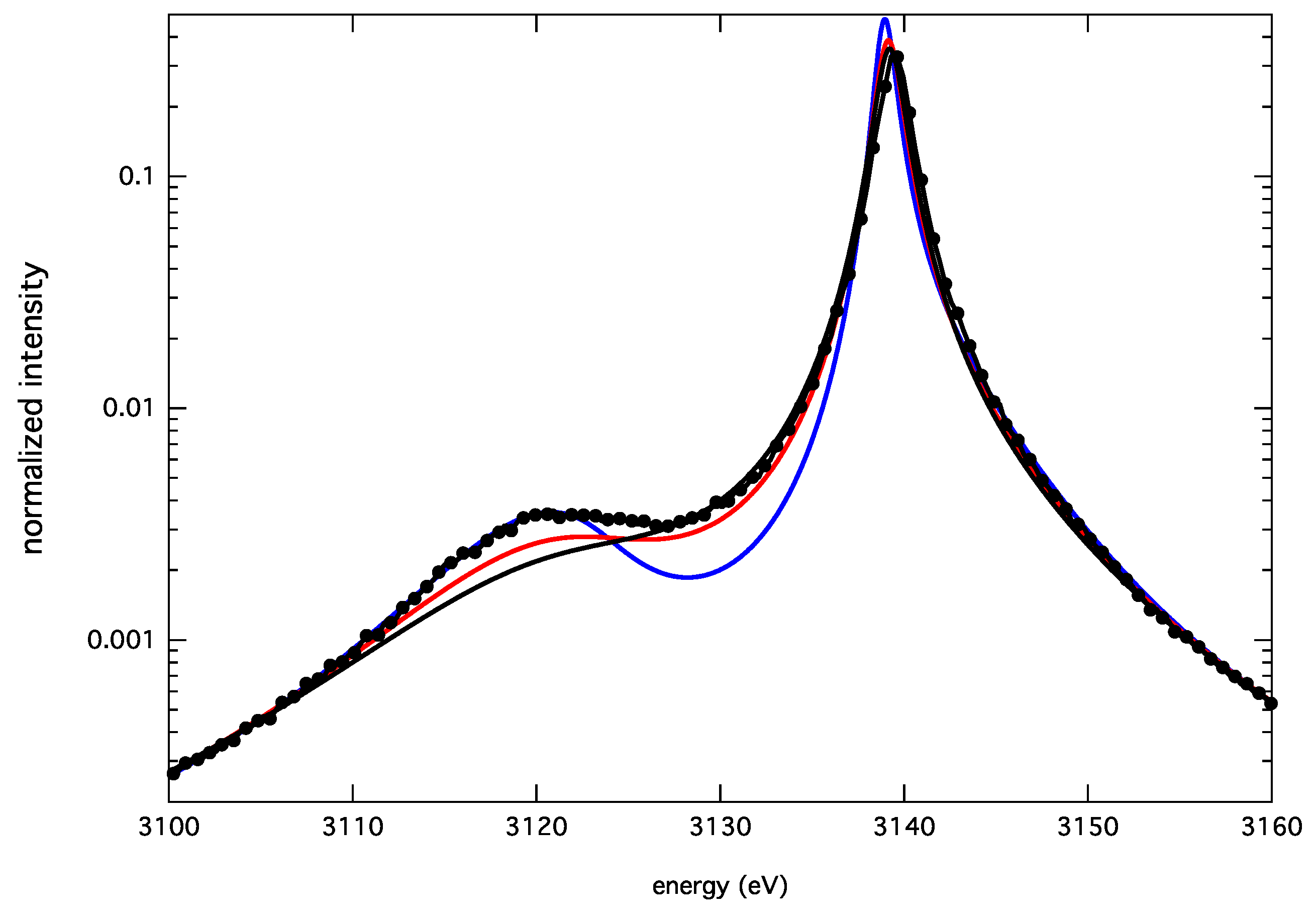 The He-α line, the strong component for keV and cm: SimU (black circles); FFM with eV (solid blue); eV (solid red); and eV (solid black).