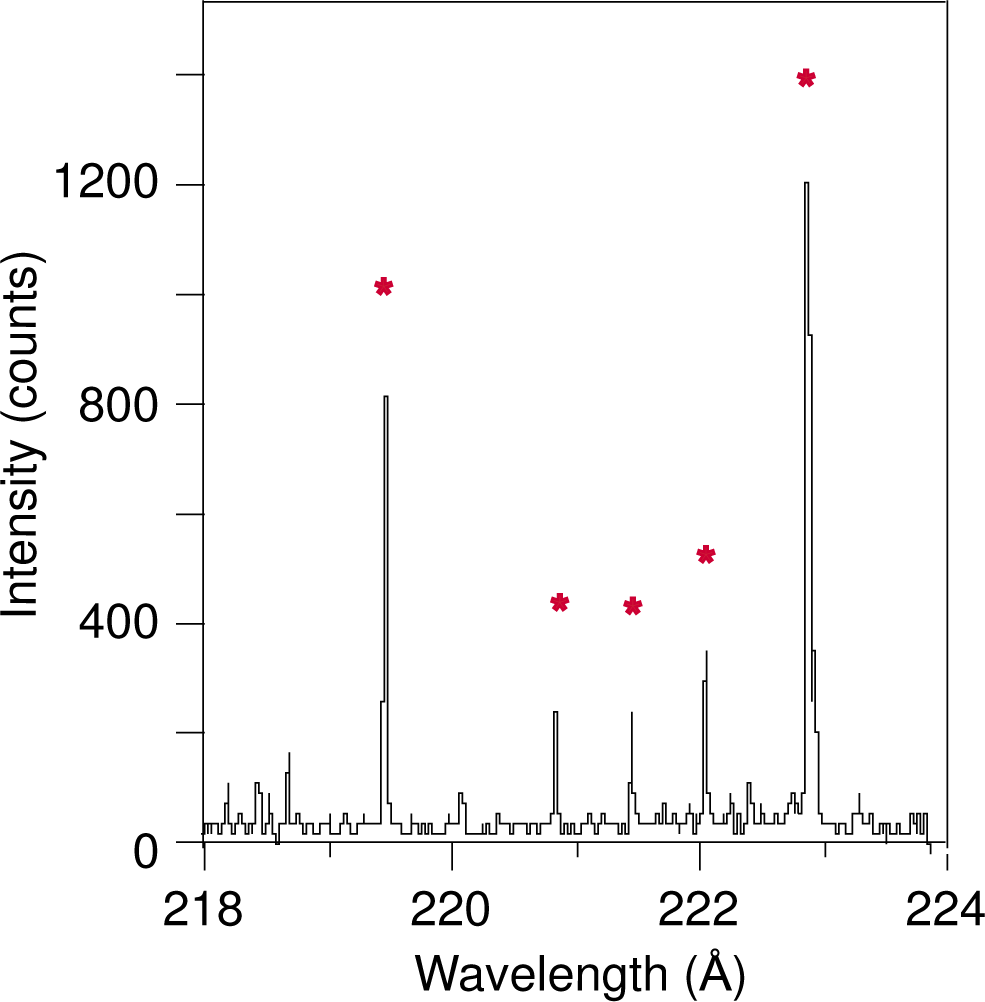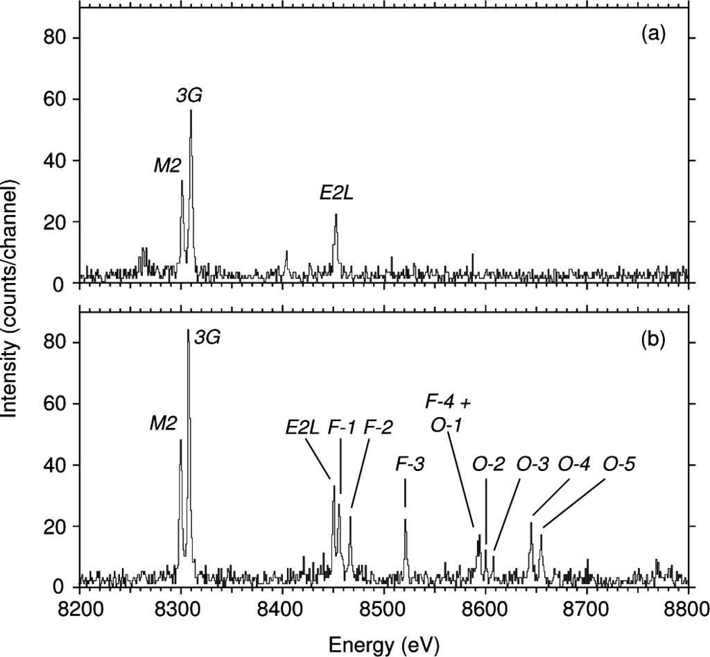 In Figure 1, we show the X-ray spectrum of the 3s → 2p transitions of neon-like W64+ near 8500 eV. The figure illustrates the power of our measurement approach: new lines are observed when the energy of the electron beam is increased to allow the production of a higher ionization state. Lines from fluorine-like and oxygen-like tungsten appear as the beam energy is raised from 15 to 21 keV. The lines are absent at the lower beam energy, because the ionization potential of neon-like W64+ is calculated to be 15,603.6 eV, while the ionization potential of fluorine-like W66+ is calculated to be 15,965.5 eV [1]. L-shell X-ray transitions from tungsten ions are of special interest for the ITER tokamak, because they are under consideration as an ion temperature diagnostic of the core plasma [6].