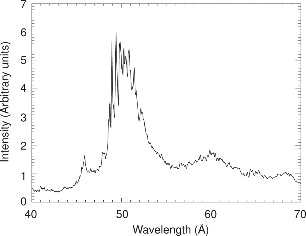 Because several of our spectrometers have been installed on magnetic fusion devices in the United States [61–66], we can obtain tungsten spectra also from these sources, provided that tungsten is introduced into these machines. One such spectrum is shown in Figure 3. It was obtained on the Alcator C-mod tokamak at the Massachusetts Institute of Technology [67] and shows bright tungsten emission near 50 Å. Comparison with spectral data from other fusion machines, notably from the Large Helical Device in Japan [68], points to charge states silver-like W27+, palladium-like W28+ and ruthenium-like W29+ as the strongest emitters, as described by Podpaly et al. [67].