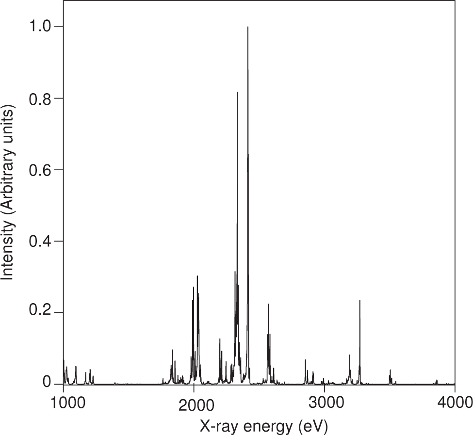In Figure 4, we show a spectrum predicted by our modeling calculations for vanadium-like W51+ in the 1000 to 4000 eV X-ray range. This was part of a large effort that produced theoretical spectral data from germanium-like W42+ through vanadium-like W51+ [70].