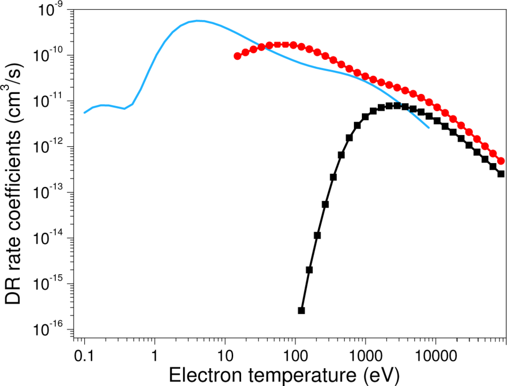 Total dielectronic recombination rate coefficients for neon-like W64+ (black trace with solid squares), sodium-like W63+ (red trace with solid circles) and copper-like W45+ (light blue trace) recombining into their respective next lower ionization state.