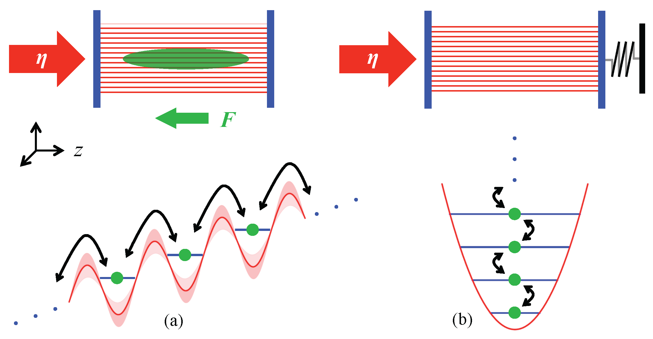 (a) An optical lattice is created by pumping a Fabry–Perot cavity. The bias force F tilts the lattice potential and causes a trapped Bose–Einstein condensate (green) to undergo Bloch oscillations. Atomic backaction leads to a time-modulation of the lattice amplitude, which in turn induces coherent directed transport of the condensate, provided the total detuning from resonance is not zero. The transport corresponds to atoms climbing or descending the ladder of Wannier–Stark states, where each state is separated by the energy . (b) The archetype of cavity optomechanics is a cavity with one end mirror suspended on a spring. The motional states of the mirror correspond to the excitations of a harmonic oscillator. Cavity amplification or cooling of the mirror moves it up or down the ladder of oscillator states. Bloch oscillation dynamics in a cavity can be mapped onto standard cavity optomechanics, but with the harmonic oscillator ladder replaced by the Wannier–Stark ladder.