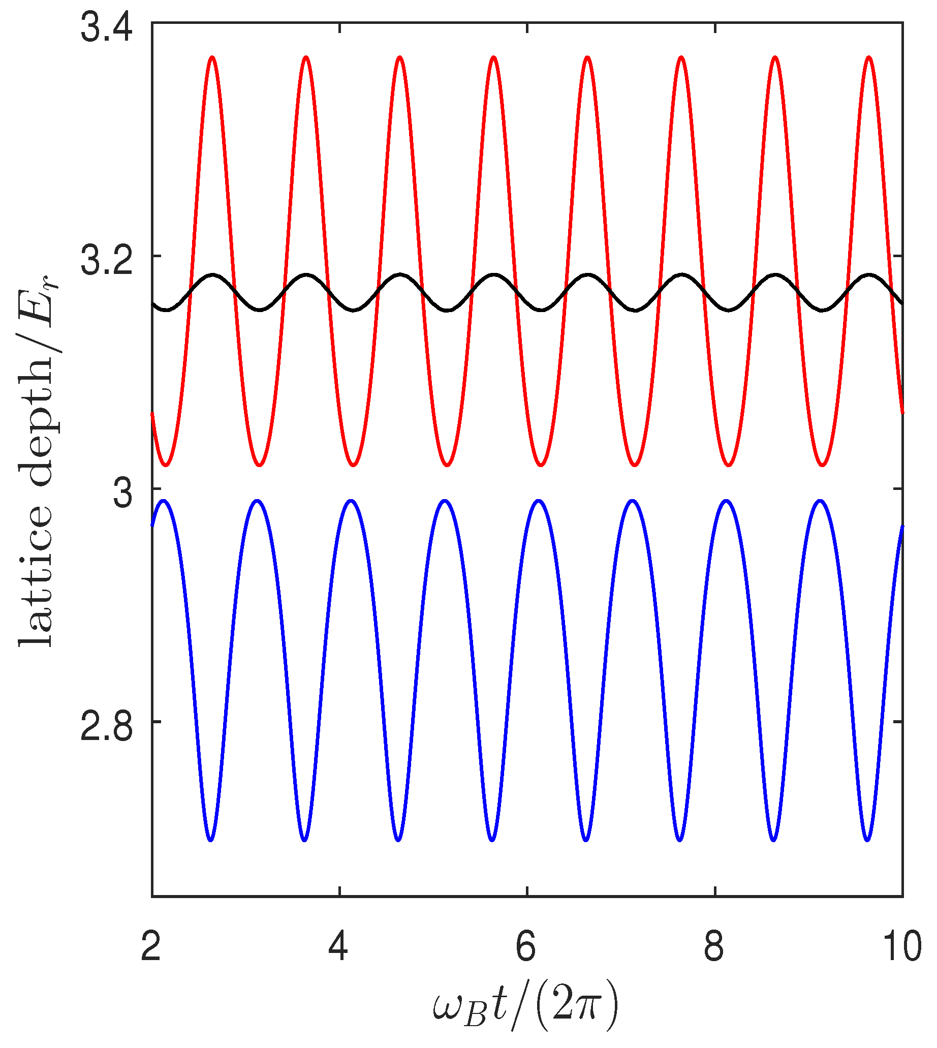 Backaction-induced modulation of the lattice depth (in units of the recoil energy ) as a function of time during intracavity Bloch oscillations. The blue (red) curve corresponds to parameters giving uphill (downhill) transport in Figure 2a. The black curve corresponds to the breathing dynamics plotted in Figure 2b.