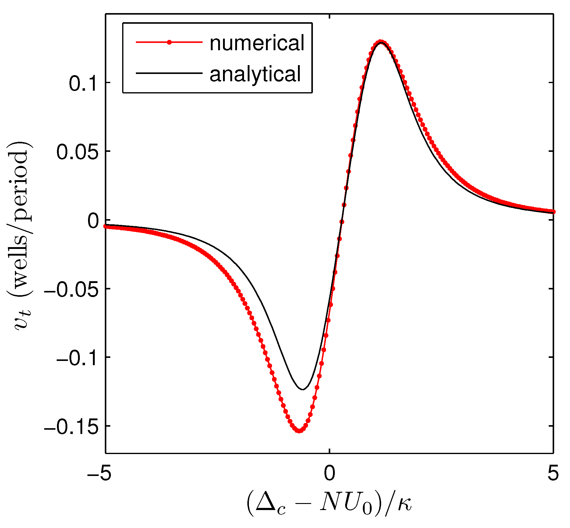 Comparison of the transport velocity as a function of the cavity-driving laser detuning calculated from the numerical simulation and using the analytical expression Equation (34). System parameters are as introduced in Figure 2a with η varied to maintain an initial lattice depth of .