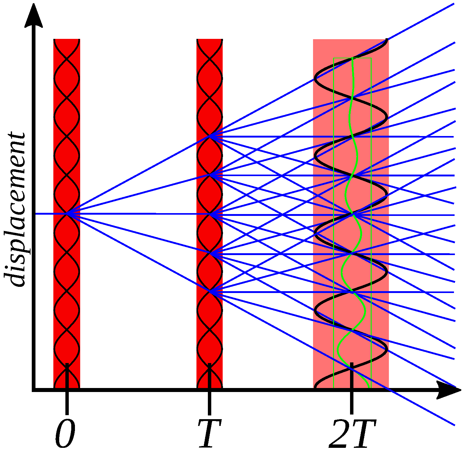 For simplicity, it is assumed that the laser pulse at time T has the same strength and affects the atomic wave function in the same manner. Each of the momentum states that were populated after the first laser pulse are split into several modes. After the second laser pulse, the number of possible paths increases dramatically. However, near time , the different paths come together to form a density modulation that has the same period as the standing wave.