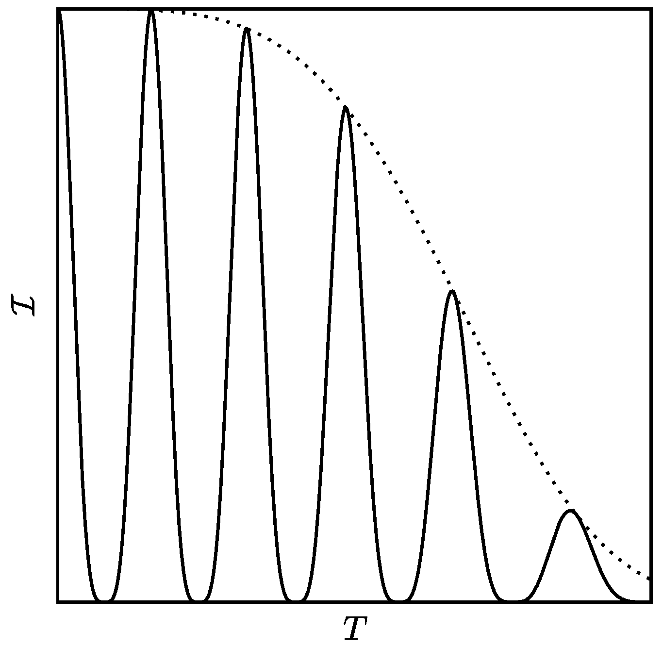 A schematic of the echo signal strength, , as a function of interferometer time, T, for an interferometer in a positive residual trapping potential, i.e., . The signal strength is proportional to the total number of backscattered photons during the readout laser pulse. is periodic with an increasing frequency within an envelope defined by the dotted curve.